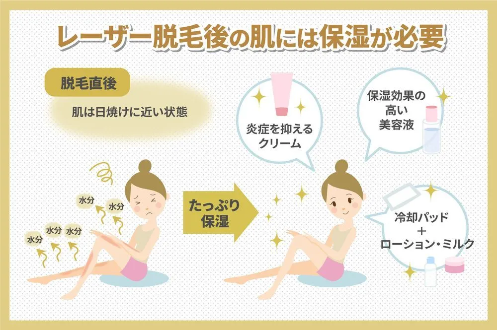 脱毛の施術を受けた後の肌は、極度の乾燥状態にあります。乾燥程度は「ほぼ日焼け」と同程度といわれるため、かなり激しい乾燥です。日焼け後の肌にたっぷりとローションを付けて保水するのと同様に、脱毛後も水分をたっぷり与えて肌を潤さなければなりません。