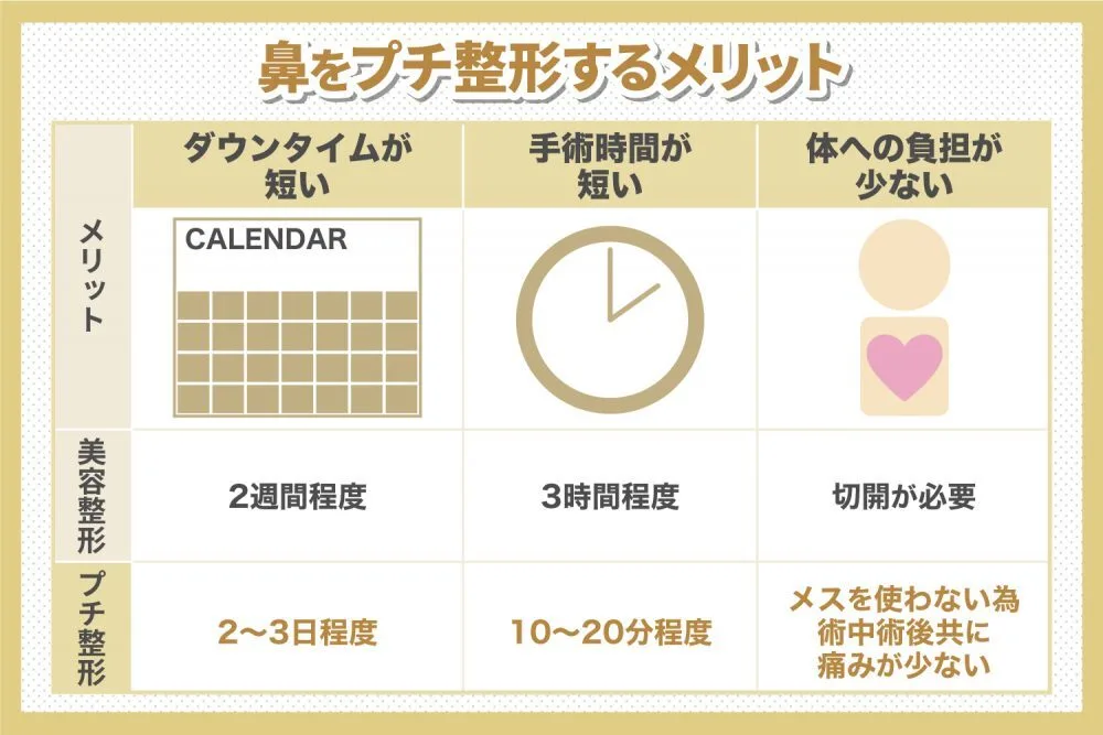 鼻のプチ整形は、メスを使わない分ダウンタイムが短いというメリットがあります。切開を伴う鼻の美容整形のダウンタイムは2週間程度。骨を削る手術の場合は、1週間程度ギプスや固定テープを鼻に装着する必要があるため、さらにダウンタイムが長くなり、術後の痛みや腫れ、内出血といった症状も強くなる傾向があります。一方で切開を伴わない鼻のプチ整形のダウンタイムはほぼなく、痛みや腫れが起きても2、3日程度で自然に収まるケースがほとんどです。手術当日の入浴や洗顔、メイクも基本的に可能であるため、「仕事が忙しくてなかなかまとまった休みが取れない」という方であっても週末を利用して手術を受けられるでしょう。