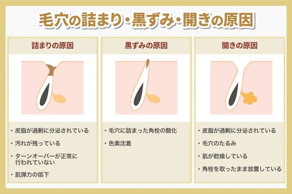 毛穴の詰まり・黒ずみ・開きのケア方法