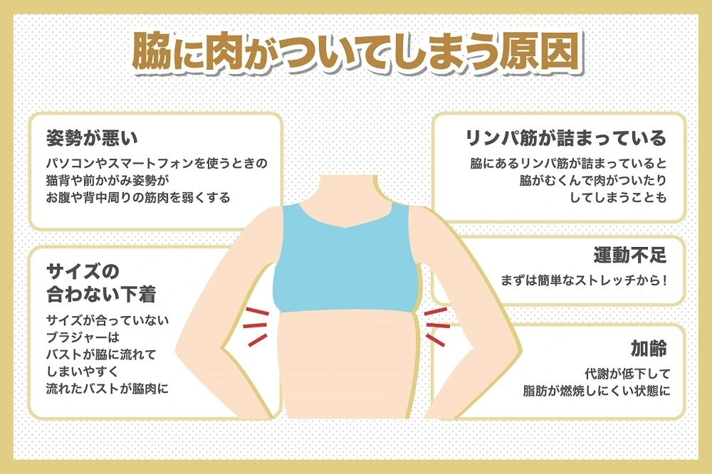 そもそもなぜ脇に肉がついてしまうのでしょうか。脇肉をなくすためにはまず原因を知って、適切に対処することが大切です。