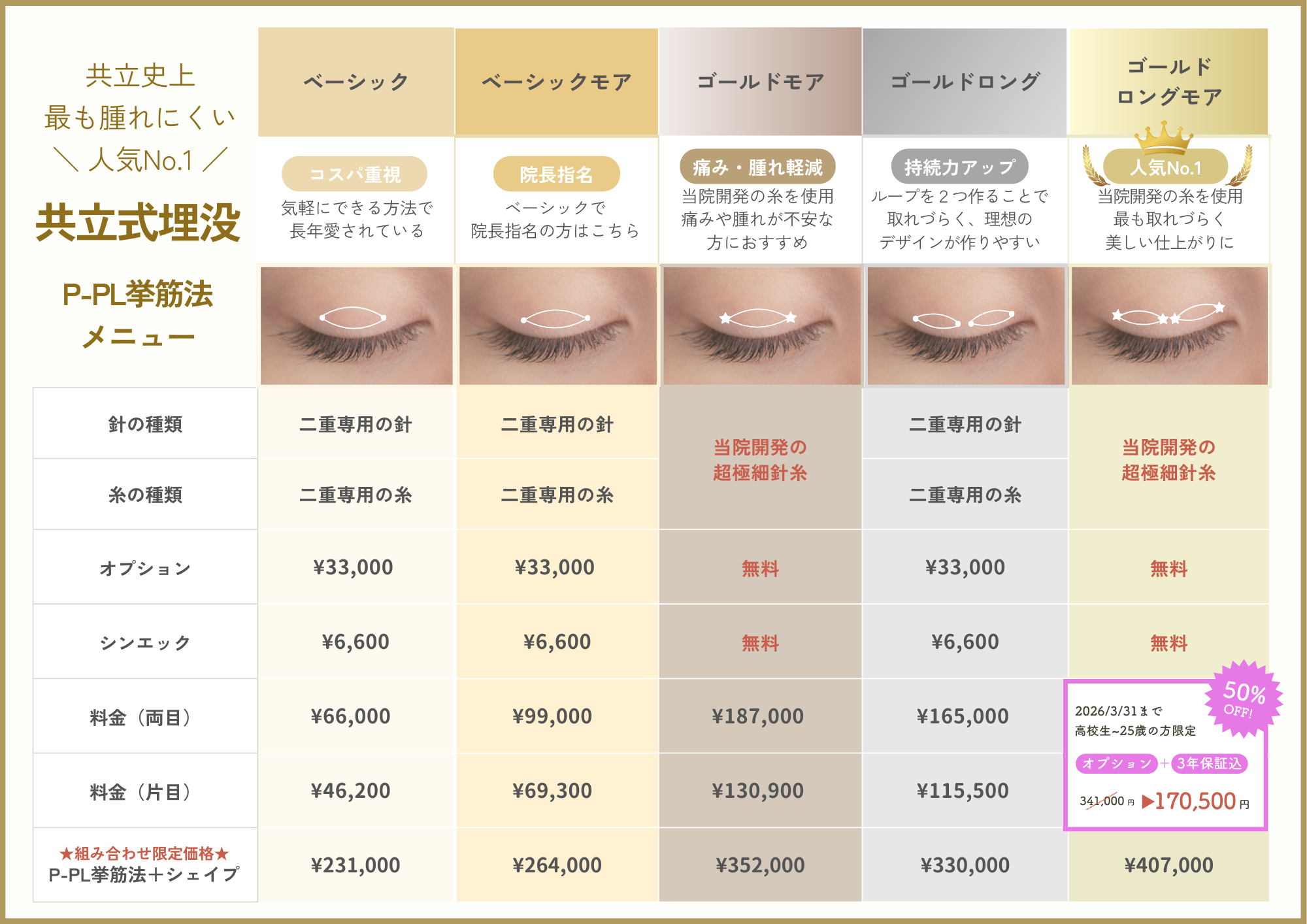 自然癒着法は、P-PL挙筋法とは異なるアプローチで、長期的な維持を目指した埋没法です。腫れの程度と持続力のバランスを、シングル・ダブル・トリプルの3段階から選ぶことができ、さらに各段階に通常タイプと「モア」(超極細針糸使用)タイプが用意されています。