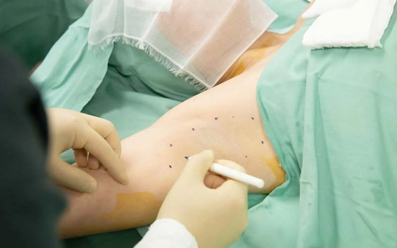 まず、ワキの消毒を行い、施術範囲のマーキングを行います。次に局所麻酔を行い、体外超音波を約3〜5分照射します。その後、ローラークランプを用いて皮膚の裏側からアポクリン汗腺と毛根などを除去吸引します。片側の施術時間は約15〜20分程度で、両ワキで合計1時間程度が目安です。