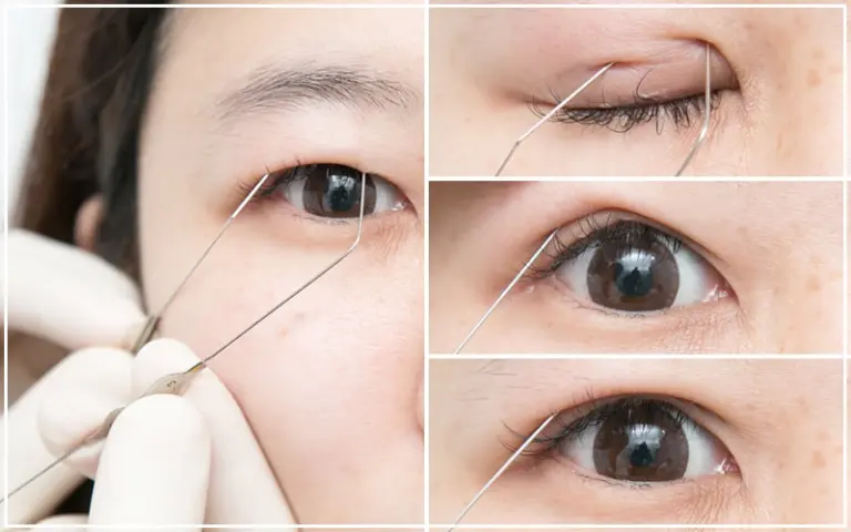 なお、埋没法では皮膚を切開しないため、切開法よりも早い段階で回復しますが、切開法では切開部分を縫合するため、抜糸までの期間中は糸が付いたままの状態になっています。
